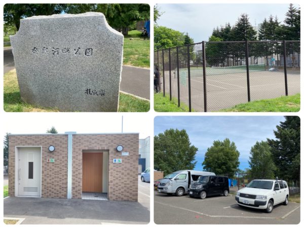 発寒河畔公園の児童会館側の入り口付近には、トイレ・駐車場(4台)・テニスコートが。 駐車場は無料で自由に停められますが、結構埋まっていることが多めです。お花見シーズンに泊めるのはほぼ困難なので。周辺の駐車場を利用するのをお勧めします。